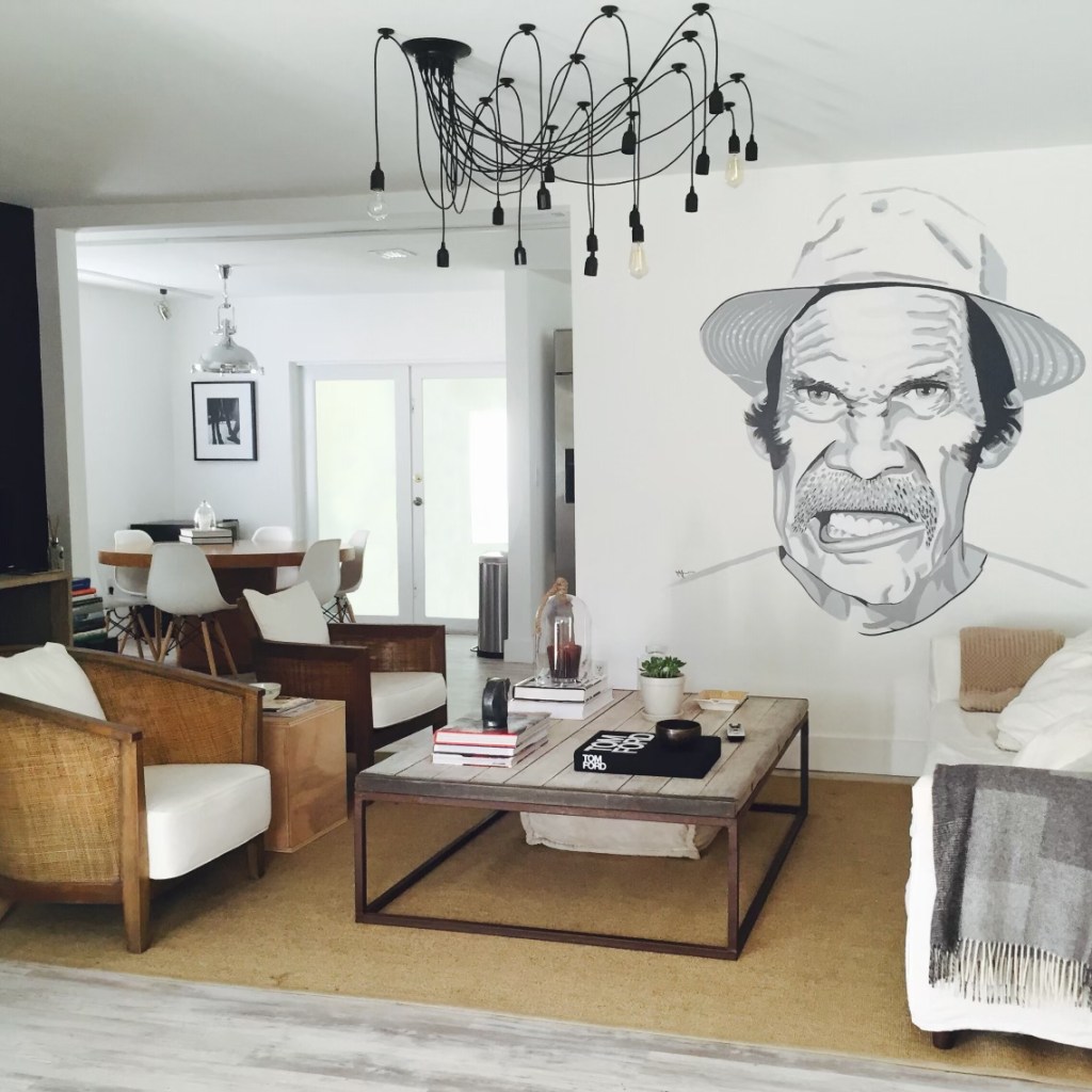 It is an earlier work from our Sisal Projects archive from 2016. Located in the heart of Miami Design District, it’s a house that indeed became a home once our team demolished and constructed a brand new interior space. Inspired by graphic art and the energy it brings, we commissioned a Puerto Rican artist to paint this stunning nine feet tall mural inside the main living room space. The art portrait is Don Ramon, a famous character in “El Chavo del Ocho,” a Mexican comedy sitcom played by Ramón Valdés.